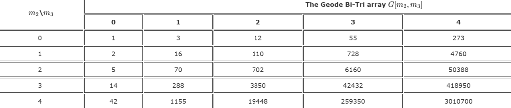 Catalan and Fuss numbers appear down the first column and row, but the rest is an enigma — we can’t find any further connections with the OEIS. Nevertheless, we offer up some intriguing conjectures on the Geode array that might help with further investigations. But it is clear that there is a lot more to study.